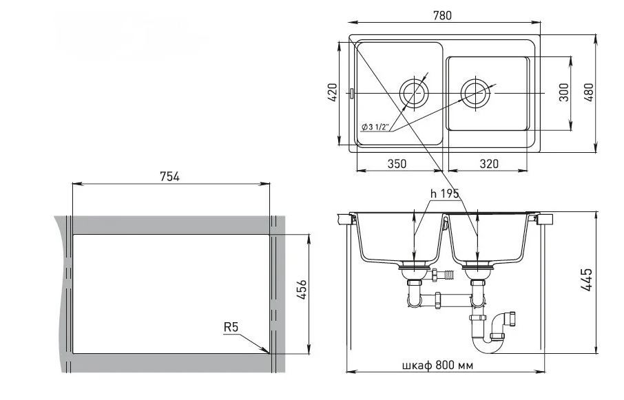 Комплектация: шаблон, крепежи, силиконовый клей, сифон