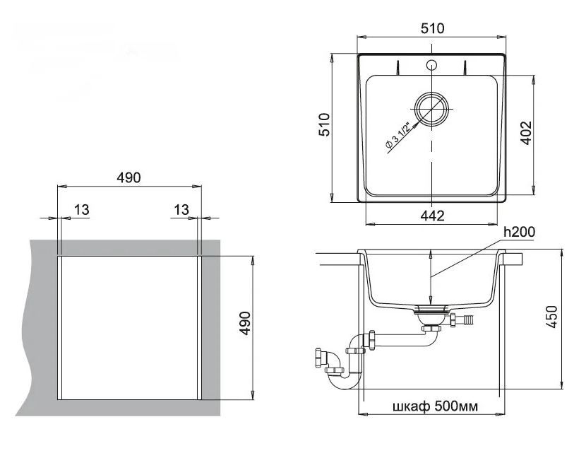 Комплектация: шаблон, крепежи, силиконовый клей, сифон