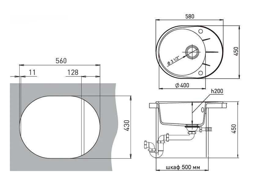 Комплектация: шаблон, крепежи, силиконовый клей, сифон