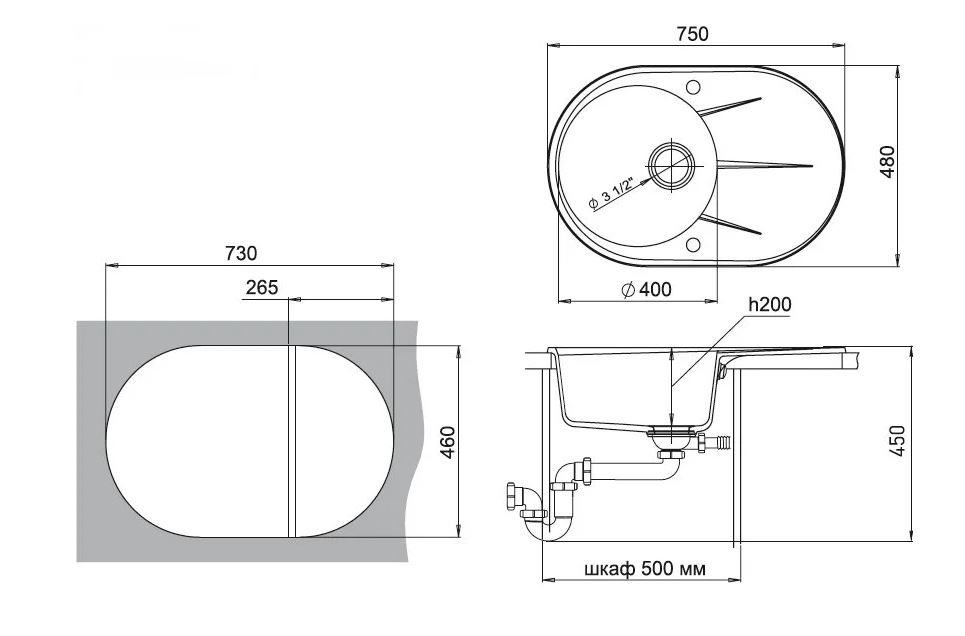 Комплектация: шаблон, крепежи, силиконовый клей, сифон