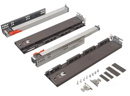 Комплектация: комплект направляющих, комплект креплений к фасаду, комплект боковин, комплект креплений задней стенки, заглушки декоративные, крепежный комплект.