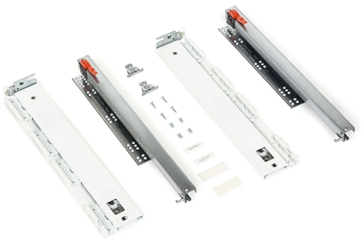 Комплектация: комплект направляющих, комплект креплений к фасаду, комплект боковин, комплект креплений задней стенки, заглушки декоративные, крепежный комплект.