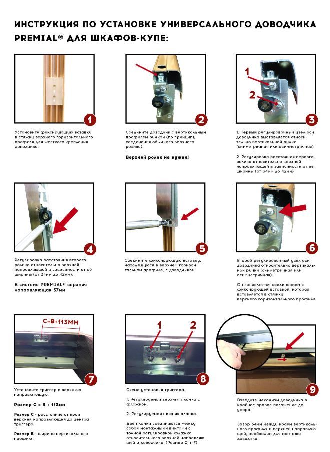 Комплектность: доводчик левый, доводчик правый, триггер левый, триггер правый, 2 крепления доводчика к верхнему горизонту, 2 самореза 6х35, 4 самореза 4х16 для крепления триггера