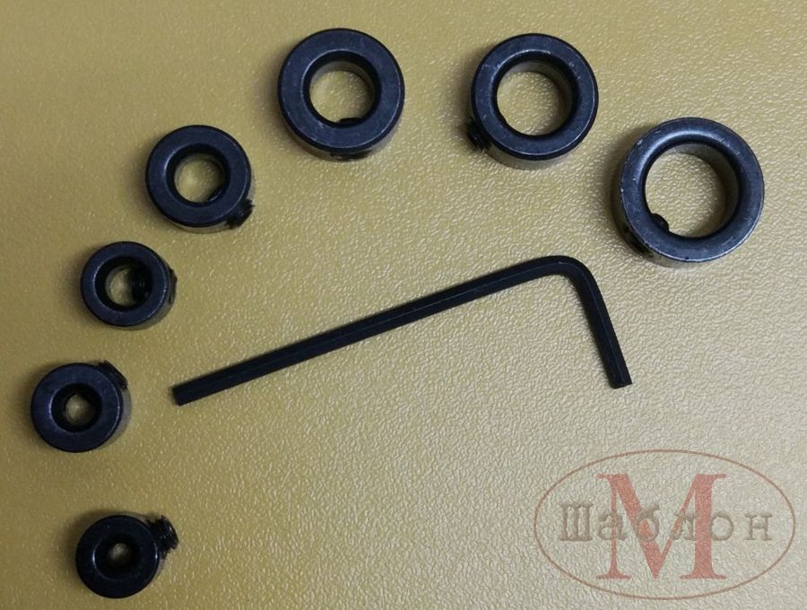Набор наружных стопорных колец с закрепляющими шестигранными потайными винтами, применяются для фиксации сверл с диаметром 3, 4, 5, 6, 8, 10 и 12 мм.