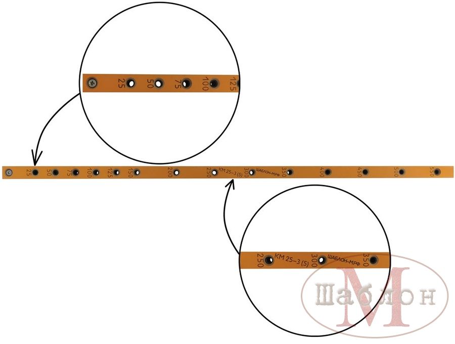 Предназначен для сверления 5 миллиметровых отверстий. Шаг 25 мм до разметки 150, после разметки 150 шаг 50 мм. Кондуктор изготовлен из пластика толщиной 16 мм, ширина 16 мм, 14 втулок из закалённой стали 45.