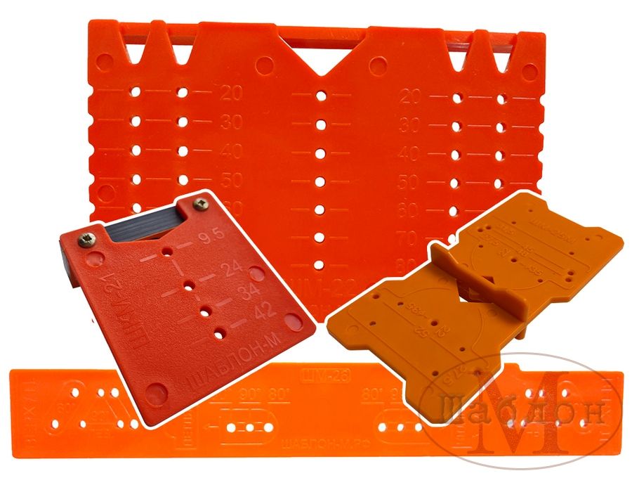 Комплект шаблонов-2 состоит из четырёх шаблонов: ШМ-25М шаблон для разметки под петли, ШМ-26 шаблон для газлифтов, ШМ-22 пластиковый шаблон для ручек, ШКМ-21 для установки эксцентриков и мебельных стяжек.