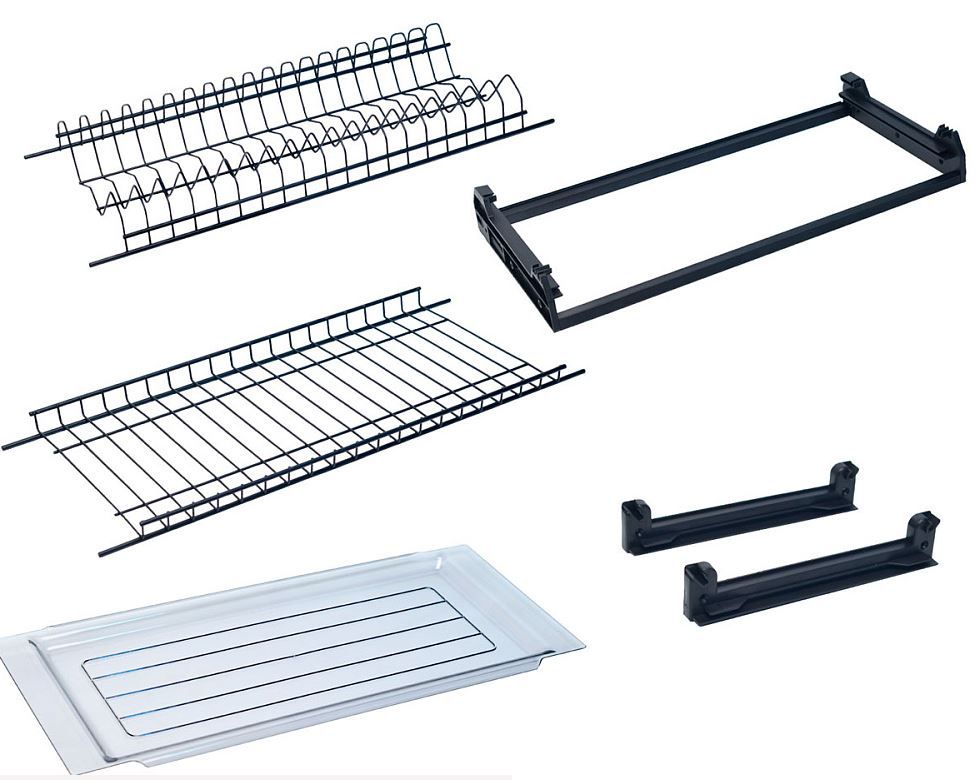 В комплекте: сетка для стаканов, сетка для тарелок, крепление нижнего яруса сушки, пластиковый поддон, комплект креплений верхнего яруса сушки с пазом под поддон.