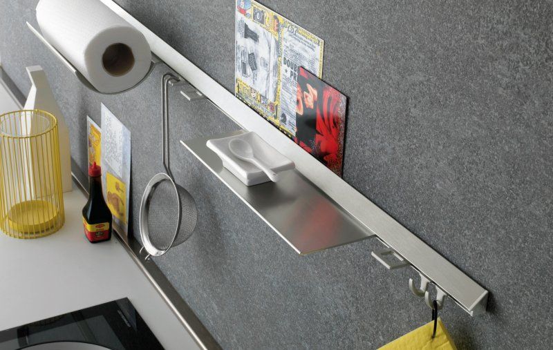 В комплекте: рейлинг на стену 900 мм, 2 пластины для крепления к стене, 2 заглушки для рейлинга, 4 крючка, 2 квадратных держателя, 1 полка для рулонной бумаги из алюминия, 1 полка для специй.