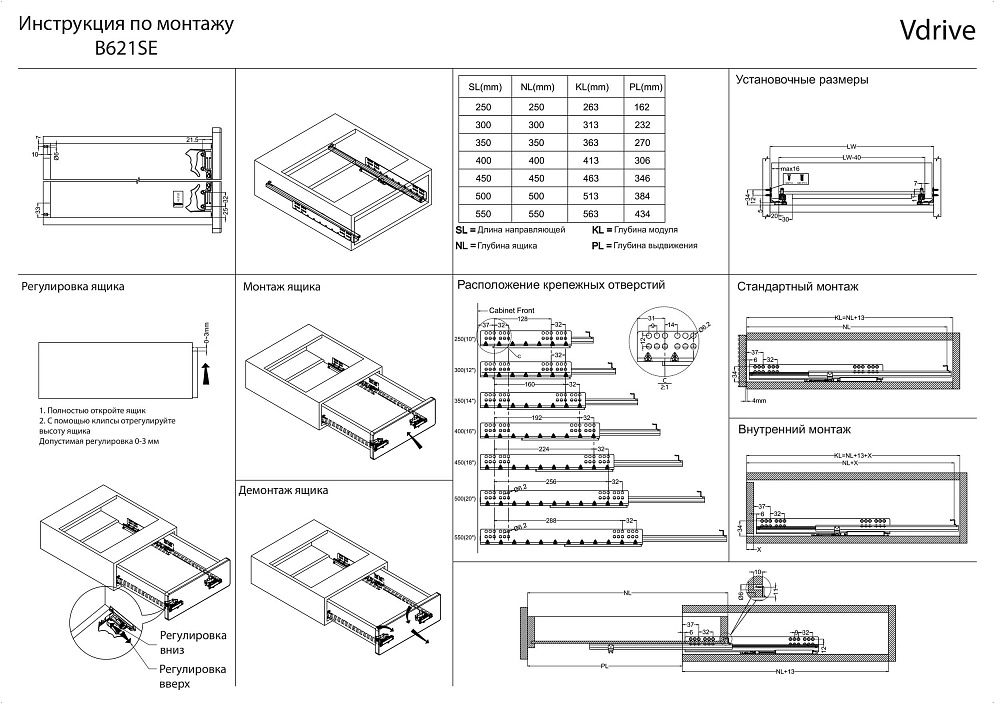 Направляющие VD 621SE Clip On скрытого монтажа частичного выдвижения L450мм