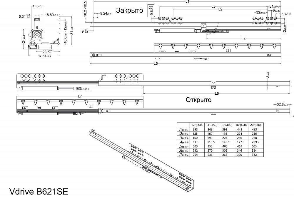 Направляющие VD 621SE Clip On скрытого монтажа частичного выдвижения L500мм