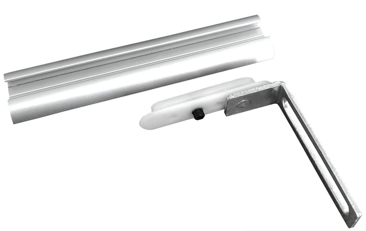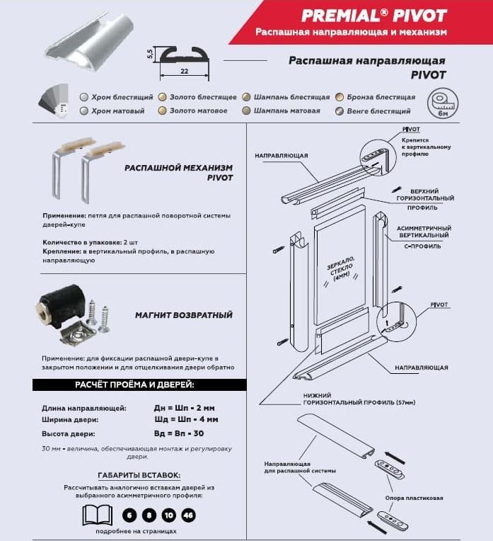 Распашной механизм состоит из алюминиевой втулки, которая вставляется в отверстие из твердого пластика. Механизм крепится на вертикальном асимметричном профиле-ручке двери и фиксируется в распашной направляющей снизу и сверху. Предельные размеры дверей — 600х2750, вес дверей — до 30 кг.