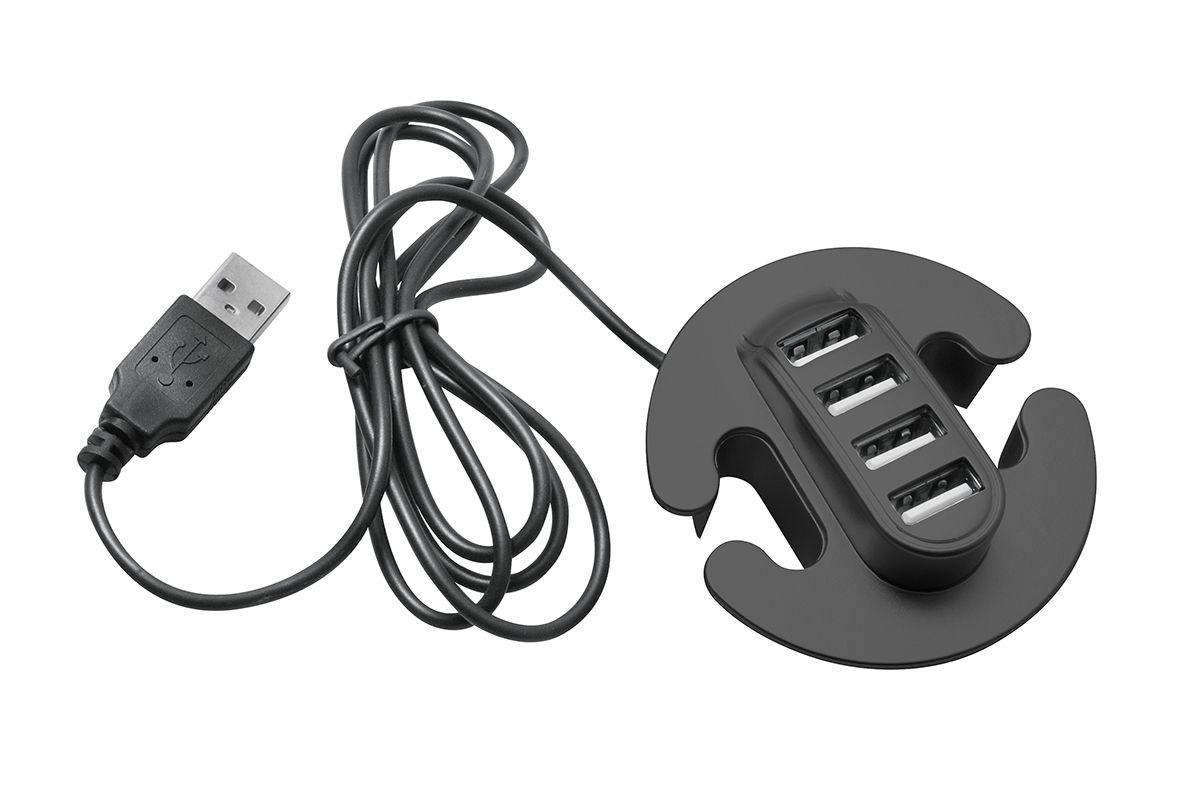 Разветвитель для USB на 4 порта черный - удобное устройство на работе и в быту, когда вам необходимо одновременно подключить несколько приборов с USB-штекерами. Разветвитель имеет 4 входа USB и устанавливается в столешницу, в предварительно сделанное отверстие соответствующего диаметра. Конструкция предусматривает проёмы в корпусе, позволяющие использовать разветвитель как заглушку кабель-канала.