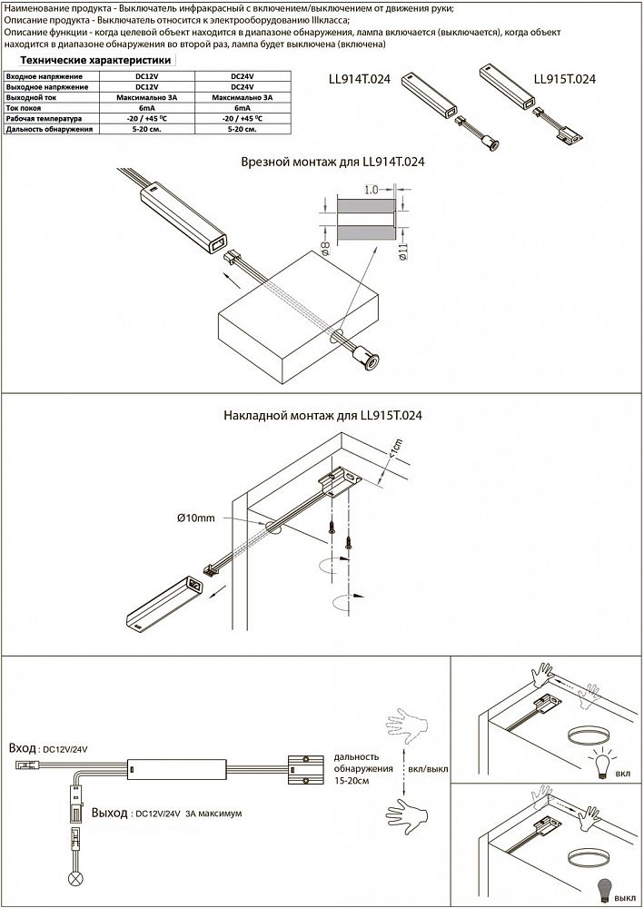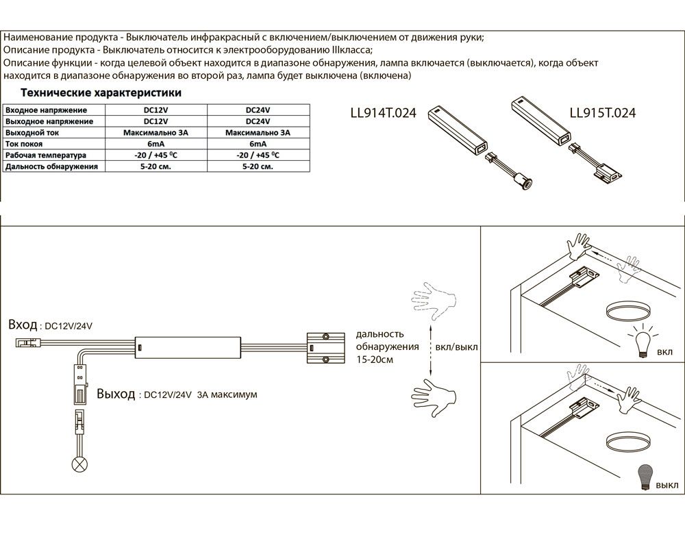 Принцип работы выключателя с включение/выключением "на взмах руки": когда целевой объект находится в диапазоне обнаружения, лампа включается (выключается), когда объект находится в диапазоне обнаружения во второй раз, лампа будет выключена (включена).